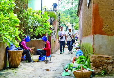游客在云南昆明西山区团结街道乐居村游玩时经过村内菜市场。新华社发