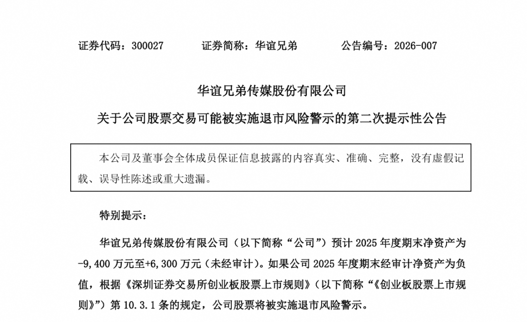 近年来,华谊兄弟陷入经营困境。2018年至2024年,华谊兄弟7年累计亏损超82亿元。今年1月30日,华谊兄弟发布公告,预计2025年度归母净利润亏损2.89亿元至4.07亿元,2025年度期末净资产为-9400万元至6300万元(未经审计)。