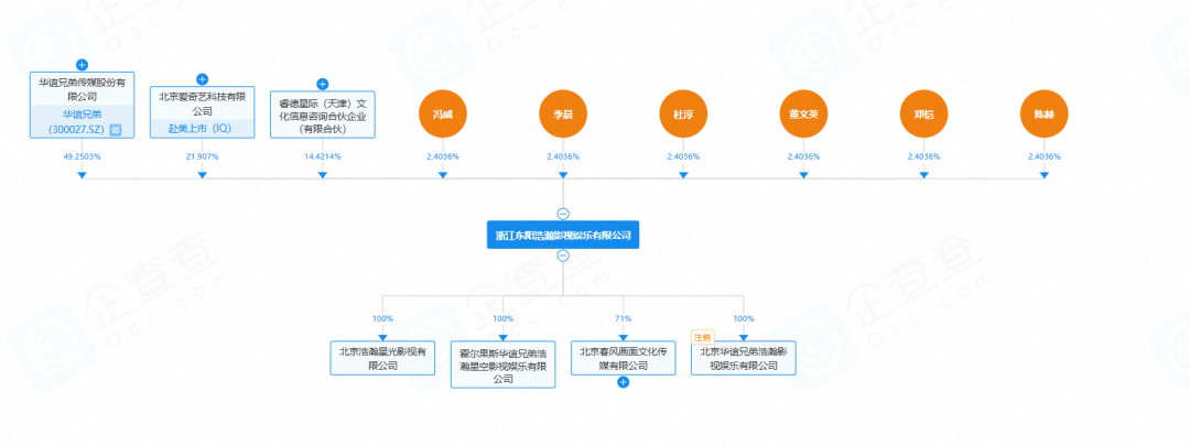 企查查数据显示,《逐玉》出品方之一浙江东阳浩瀚影视娱乐有限公司(以下简称:东阳浩瀚),由华谊兄弟持股49.25%,实际控制人为王忠军和王忠磊。另外,东阳浩瀚的股东席位中还有爱奇艺以及多位明星股东如冯绍峰(冯威)、陈赫、郑恺、杜淳等。