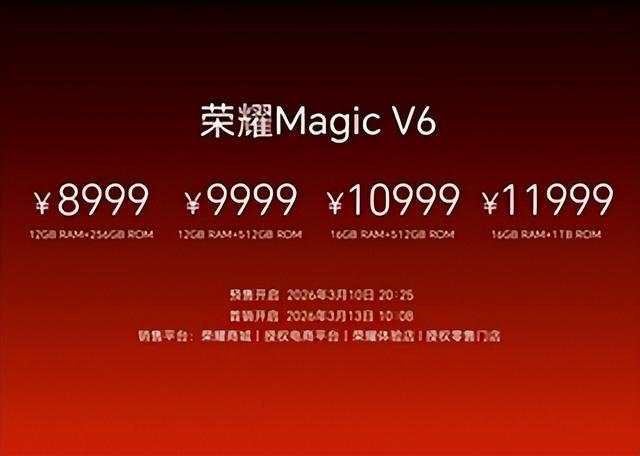 定价上,荣耀Magic V6共4个版本:12GB+256GB售价8999元;12GB+512GB售价9999元;16GB+512GB售价10999元;16GB+1TB售价11999元。之所以说荣耀Magic V6是万元机,是因为到了这个价位,不太有人会选256GB丐版了,至少也是12GB+512GB。
