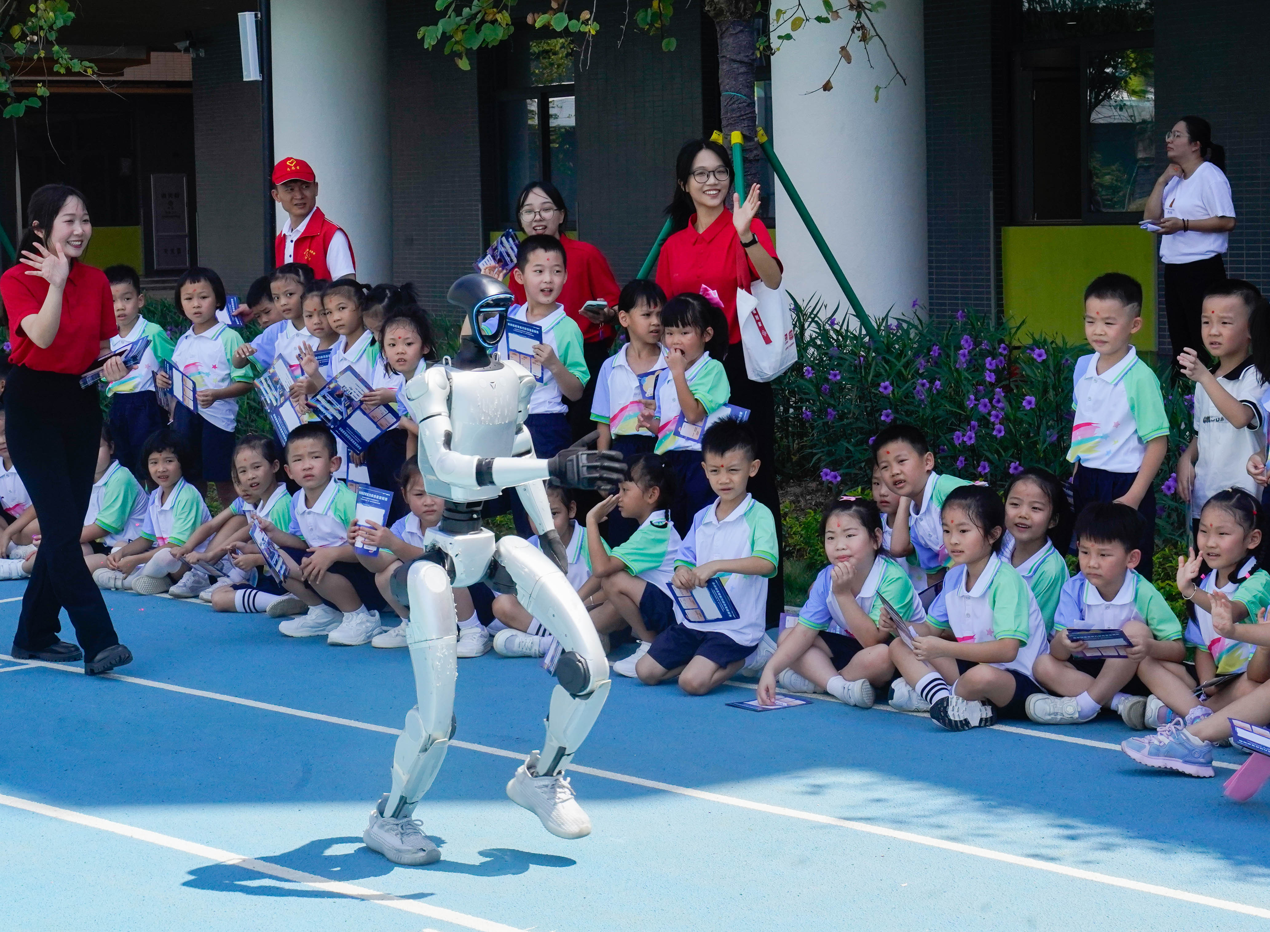 与机器人赛跑、看机器狗舞狮、戴上VR眼镜畅游元宇宙……在上一周中国教育科学研究院南沙实验小学的开学典礼上,“AI味”十足的教学引起了孩子们的浓厚学习兴趣,也引起参观者的惊叹。